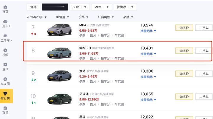 零跑B01的销量曲线,对一台全新车型而言几乎是“奇迹”。上市第二个月销量就稳稳破万,11月更是热销13401台,牢牢占据紧凑型轿车销量榜前列。