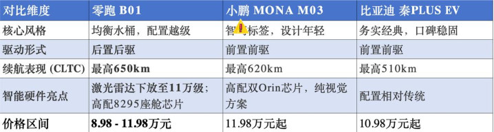 目前这个价位段,用户主要纠结的选项无非是比亚迪秦PLUS EV和小鹏MONA M03。通过与这两位“优等生”的简单对比,B01的差异化打法就清晰了: